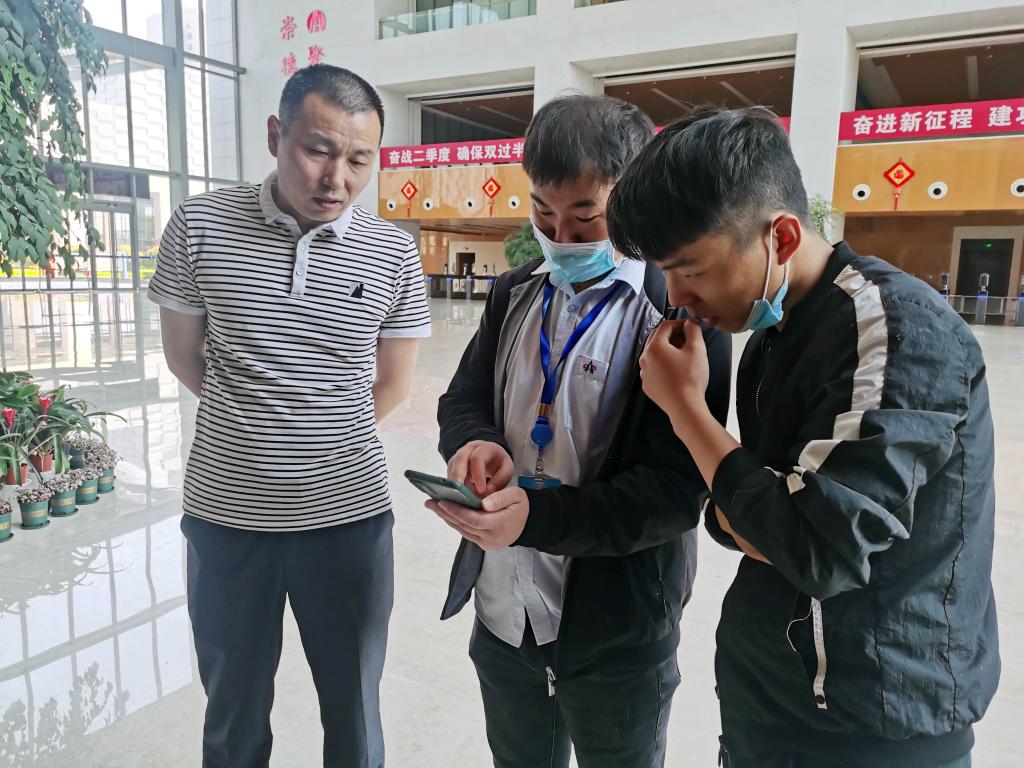 5月2日上午10:10,辦公中心西門崗值班職工孫正國(左一)在對訪客做疫情防控“雙碼”檢查。他表示,“五一”期間也要嚴格把好“入口關”,堅決保證疫情防控安全。
