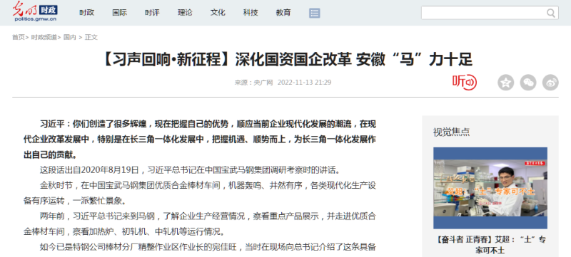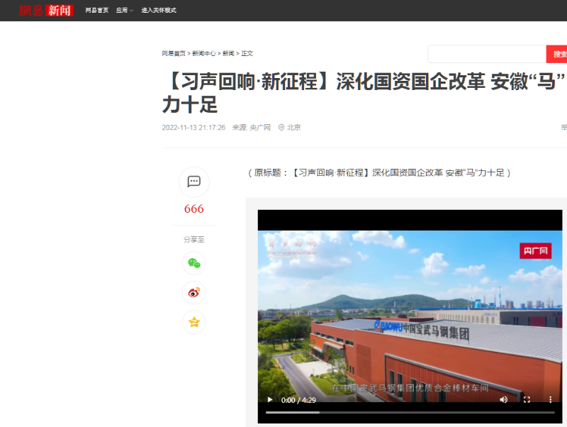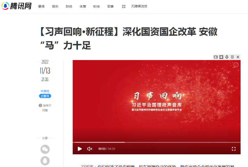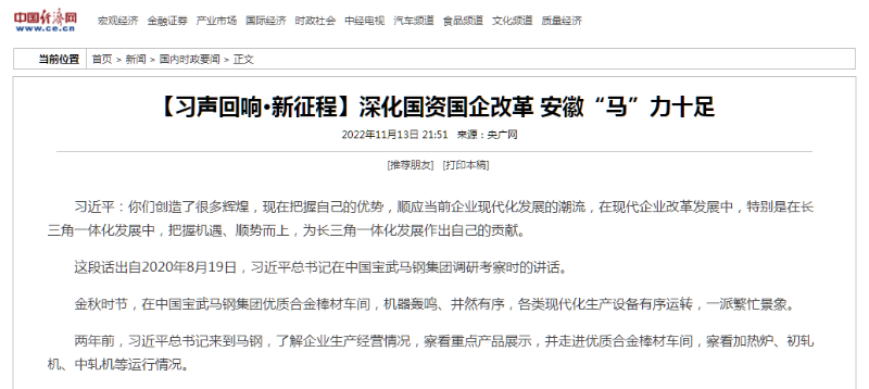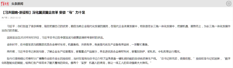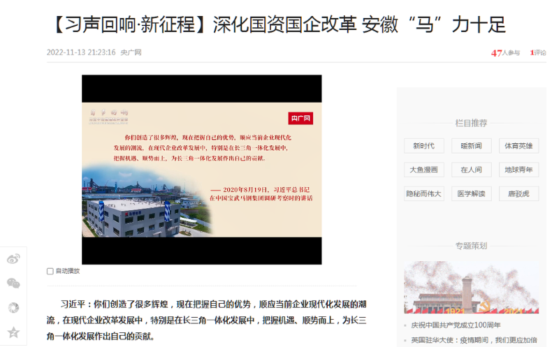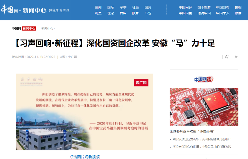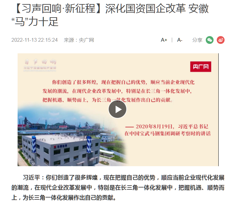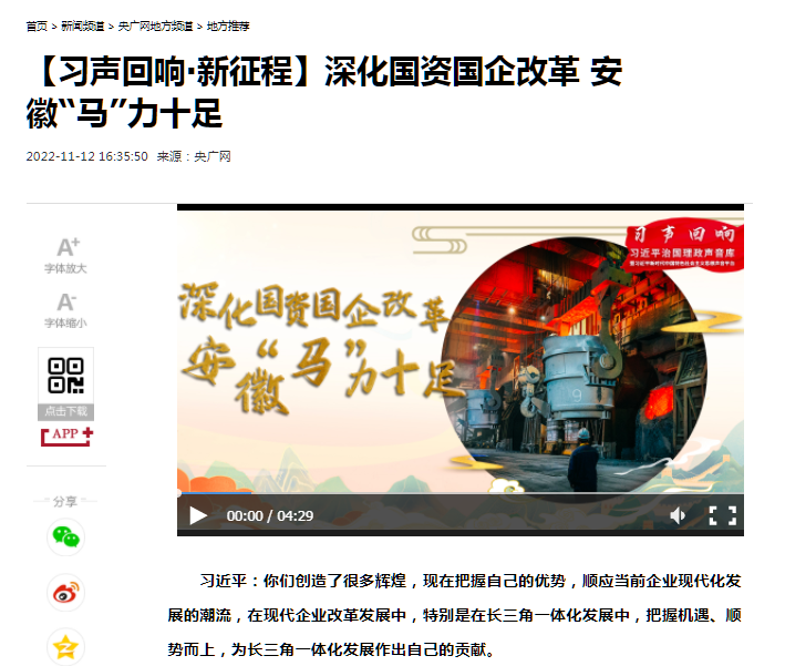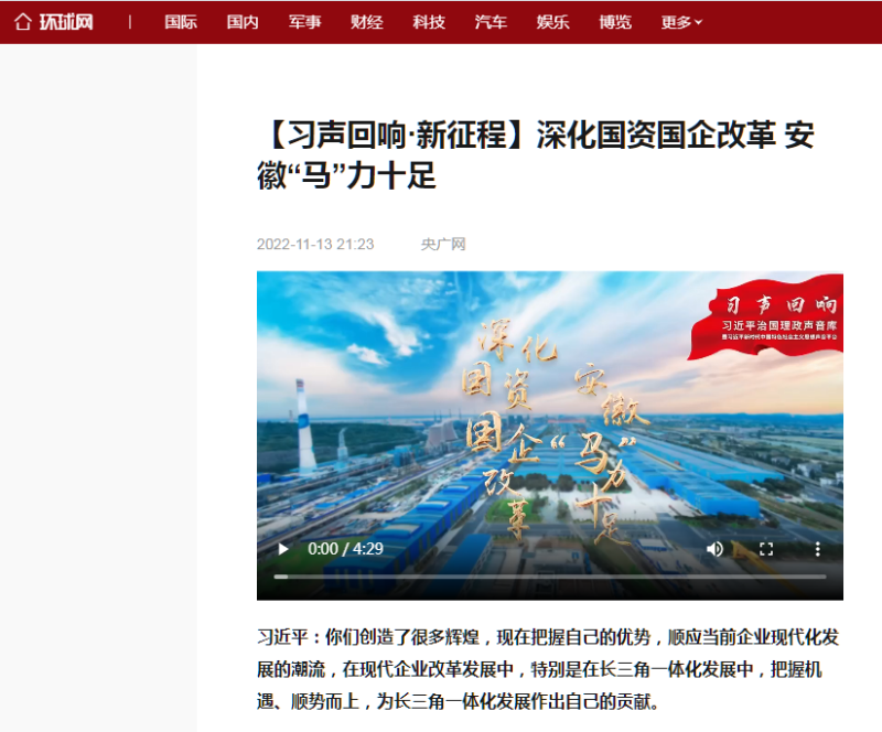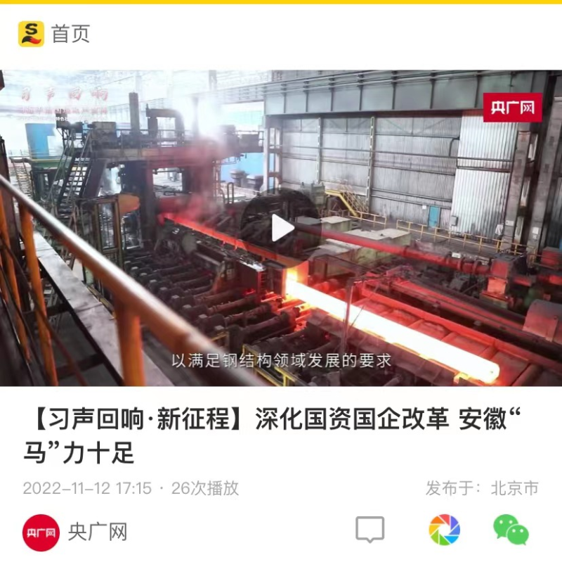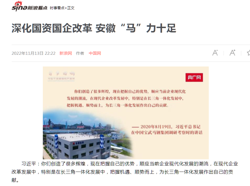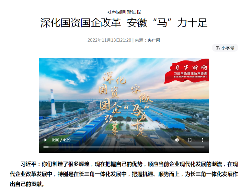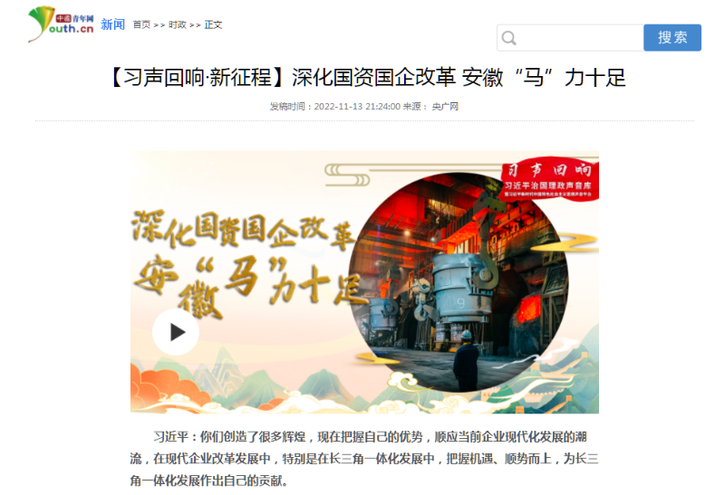 搶抓發(fā)展機遇,敢為時代先鋒。國企改革三年行動以來,安徽國資國企深化改革創(chuàng)新,不斷轉型突破,推動省屬企業(yè)高質量發(fā)展邁上新臺階。2021年,安徽省屬國有企業(yè)經營業(yè)績創(chuàng)歷史最好水平。今年上半年,省屬企業(yè)資產總額首次突破2萬億元。目前,安徽省國企改革三年行動的129項重點任務已基本完成。央廣網、人民網、中國網、中華網、光明網、環(huán)球網、中國經濟網、中國青年網、中青在線、新浪網、網易網、騰訊網、搜狐網、鳳凰網等15家全國主流媒體及30余家省級主流媒體對此進行了集中報道。