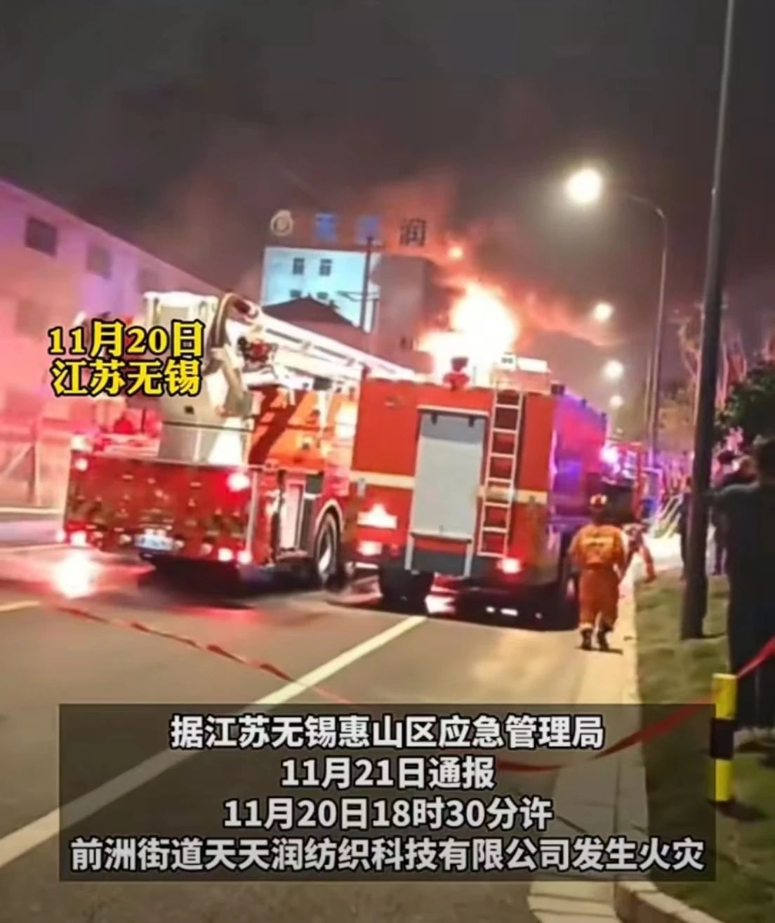 2023年11月20日18時(shí)30分許,江蘇省無(wú)錫市惠山區(qū)前洲街道天天潤(rùn)紡織科技有限公司發(fā)生火災(zāi),事故造成7人死亡。