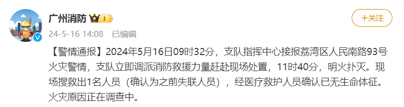 5月16日,廣東省廣州市荔灣區(qū)人民南路93號火災(zāi)警情,據(jù)廣州市消防救援支隊消息,截至當(dāng)日11時40分,明火已被撲滅。
