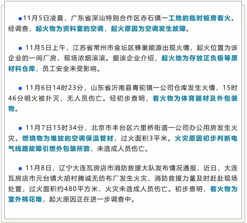 隨著冬日到來,氣候寒冷、干燥、多風(fēng),傳統(tǒng)節(jié)日、大型活動(dòng)集中,用火用電用氣量增加,火災(zāi)呈現(xiàn)易發(fā)多發(fā)之勢(shì)。根據(jù)有關(guān)火災(zāi)數(shù)據(jù)統(tǒng)計(jì),一年中冬季火災(zāi)起數(shù)占比最大,特別是第四季度生產(chǎn)、經(jīng)營(yíng)、建設(shè)活動(dòng)頻繁,火災(zāi)形勢(shì)嚴(yán)峻復(fù)雜。進(jìn)入11月以來,多地建筑工地、工廠倉(cāng)庫(kù)等生產(chǎn)經(jīng)營(yíng)場(chǎng)所接連發(fā)生火災(zāi),值得高度警惕!